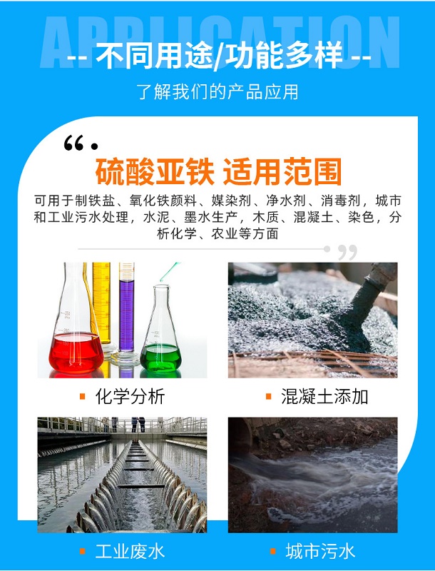 先簡單給您說下硫酸亞鐵,硫酸亞鐵是一種凈水處理劑,具有可調(diào)節(jié)堿性水中的PH值,于水中懸浮物有機結(jié)合 加速沉淀,用于水質(zhì)凈化和工業(yè)廢水處理。