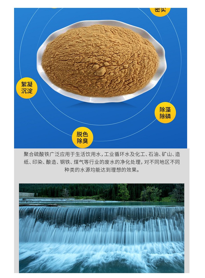 聚合硫酸鐵鵬程很早熱賣的一種的凈水劑,使用至今,產(chǎn)量還不斷遞增。為了滿足多種行業(yè)廢水處理,又開發(fā)出除氨、氰化物及造紙廢水處理的不同要求的新型聚合硫酸鐵。使用時ph值適應(yīng)范圍廣(ph4-11),生成的絮凝物比重大,沉降快,對去除水中的濁度(SS)、BOD、COD、色度、臭氣及部分金屬離子效果均很好,水中殘留鐵離子少,水解產(chǎn)物脫水性能好,泥餅含水率低等優(yōu)點(diǎn),是一種高效的應(yīng)用較廣的水處理劑。